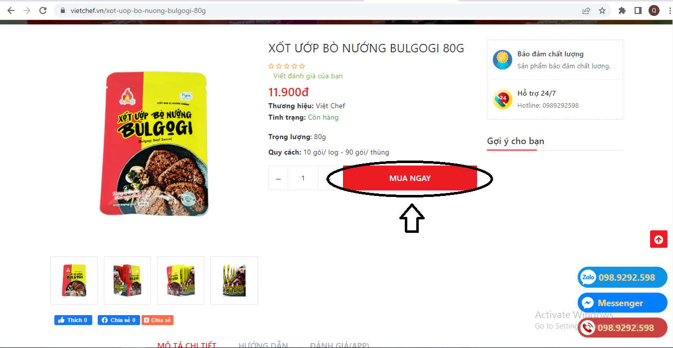 - Sau khi tìm kiếm và lựa chọn được sản phẩm ưng ý cho mình, Quý khách vui lòng đến trang chi tiết sản phẩm để xem hàng. Tại đây, khách hàng chọn Số lượng sản phẩm muốn mua và chọn mua sản phẩm bằng cách bấm chuột vào nút "MUA NGAY".