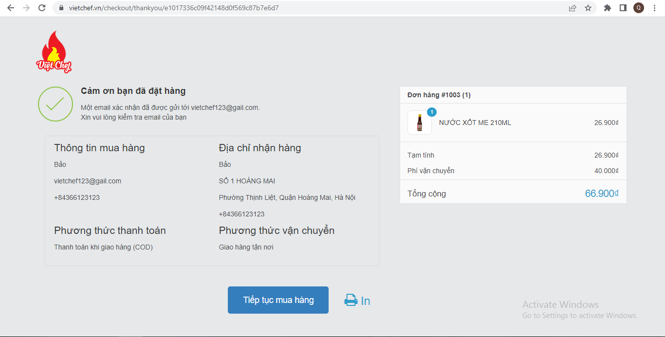 - Sau khi "ĐẶT HÀNG" quý khách sẽ chuyển tới trang xác nhận gửi đơn hàng thành công.
